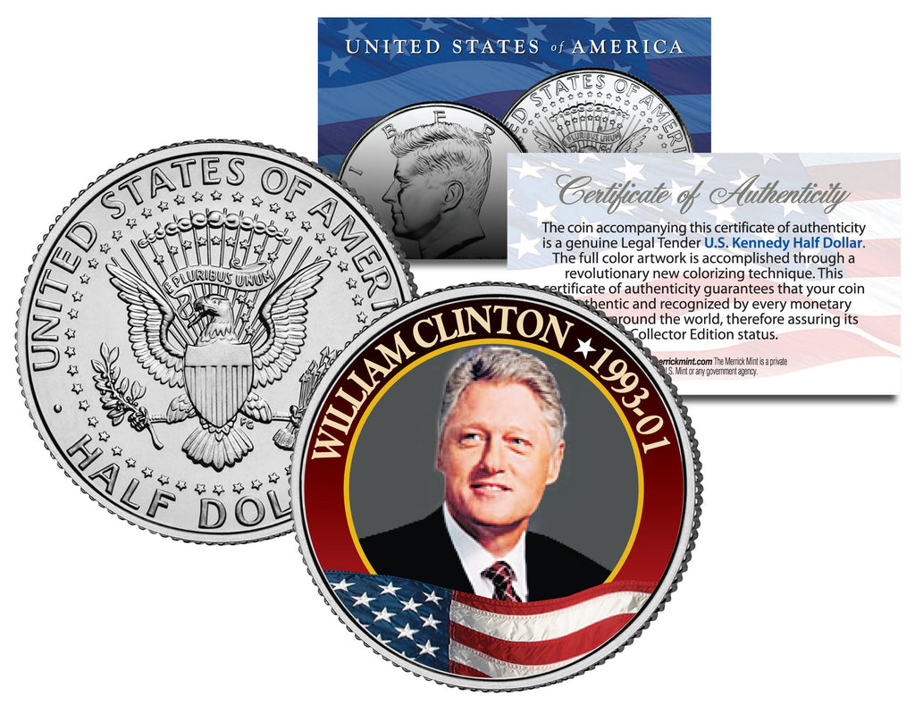 William Jefferson "Bill" Clinton was the 42nd President of the United States, serving from 1993 to 2001. Here is your opportunity to own or to gift the “WILLIAM CLINTON – 1993-2001” colorized JFK Kennedy Half Dollar U.S. Coin, which has been enhanced with a beautifully colorized image by the Merrick Mint. Each coin comes in a premium coin capsule with a full color Certificate of Authenticity to guarantee that your coin is authentic and recognized by every monetary authority around the world, assuring its Collector Edition status. This Legal Tender United States coin has been colorized with an application of special inks directly to the surface of the coin, using a unique and painstakingly multicolor coin process, which achieves a level of detail, color saturation, and durability that is #1 in the coin industry. The result is an everlasting colorized coin collectible of ultra-high quality. The Kennedy half dollar is a U.S. fifty cent coin with coin year and mint marks chosen at random.