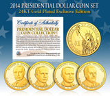Here is your chance to own a complete set of four (4) 24KT Gold Plated 2014 Presidential $1 U.S. Coins featuring four U.S. Presidents: W. G. Harding, C. Coolidge, H. Hoover, F. D. Roosevelt. Each coin is 24KT Gold Plated by the Merrick Mint to highlight the original design using a unique authentic process. The result is an everlasting 24KT Gold Plated coin collectible of ultra-high quality that is #1 in the industry. Each coin features a common reverse design of the Statue of Liberty and a unique Presidential portrait design on the obverse. Each coin is genuine legal tender of the United States and comes in an acrylic coin holder and includes a Full Color 2-sided Certificate of Authenticity. The United States Mint issues four Presidential $1 Coins each year. These coins feature large, dramatic artwork and edge-incused inscriptions of the year of minting, or issuance, E PLURIBUS UNUM and the mint mark. The inscription IN GOD WE TRUST appears on the face of the coins. The size, weight and metal composition of the Presidential $1 Coins are identical to that of the Native American $1 Coins.