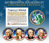 Here is your chance to own a complete set of four (4) beautifully colorized 2007 Presidential $1 U.S. Coins featuring four U.S. Presidents: Washington, Adams, Jefferson, Madison. Each coin is beautifully enhanced in permanent full-color by the Merrick Mint to highlight the original design using a unique colorizing process, which involves the application of special inks directly to the surface of a coin. The result is an everlasting colorized coin collectible of ultra-high quality that is #1 in the industry. Each coin features a common reverse design of the Statue of Liberty and a unique Presidential portrait design on the obverse. Each coin is genuine legal tender of the United States and comes in an acrylic coin holder and includes a Full Color 2-sided Certificate of Authenticity. The United States Mint issues four Presidential $1 Coins each year. These coins feature large, dramatic artwork and edge-incused inscriptions of the year of minting, or issuance, E PLURIBUS UNUM and the mint mark. The size, weight and metal composition of the Presidential $1 Coins are identical to that of the Native American $1 Coins.