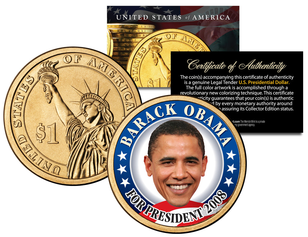 Here is your opportunity to own or to gift the “BARACK OBAMA FOR PRESIDENT 2008” colorized Inaugural George Washington 2007 Presidential $1 U.S. Coin, which has been beautifully enhanced with colorized images by the Merrick Mint. Each coin comes in a premium coin capsule with a full color Certificate of Authenticity. This Legal Tender United States coin has been colorized with an application of special inks directly to the surface of the coin, using a unique and painstakingly multicolor coin process, which achieves a level of detail, color saturation, and durability that is #1 in the coin industry. The result is an everlasting colorized coin collectible of ultra-high quality. The inaugural George Washington 2007 Presidential $1 U.S. Coin features a Statue of Liberty design on the reverse and a George Washington portrait design on the obverse.