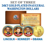 The 24KT Gold Plated Inaugural Washington Dollars 3-coin set includes Presidents: Abraham Lincoln, John F. Kennedy and Barack Obama. This 3-coin set of colorized 24 Karat Gold Plated Inaugural George Washington 2007 Presidential $1 U.S. Coins are Genuine Authentic Legal Tender of the United States, which have been layered in Genuine 24 Karat Gold, and then beautifully enhanced with colorized images of Lincoln, Kennedy and Obama by the Merrick Mint. These high-quality genuine Legal Tender United States coins have been colorized using a unique painstaking multicolor authentic process. Colorizing coins involves the unique application of special inks directly to the surface of a coin that achieves a level of detail, color saturation, and durability that is #1 in the industry. The result is an everlasting colorized coin collectible of ultra-high quality. The 3-coin set comes with Certificate of Authenticity to guaranty that your coins are authentic and recognized by every monetary authority around the world, assuring its Collector Edition status. Each coin comes in a premium coin capsule. The inaugural George Washington 2007 Presidential $1 U.S. Coin features a Statue of Liberty design on the reverse and a George Washington portrait design on the obverse.