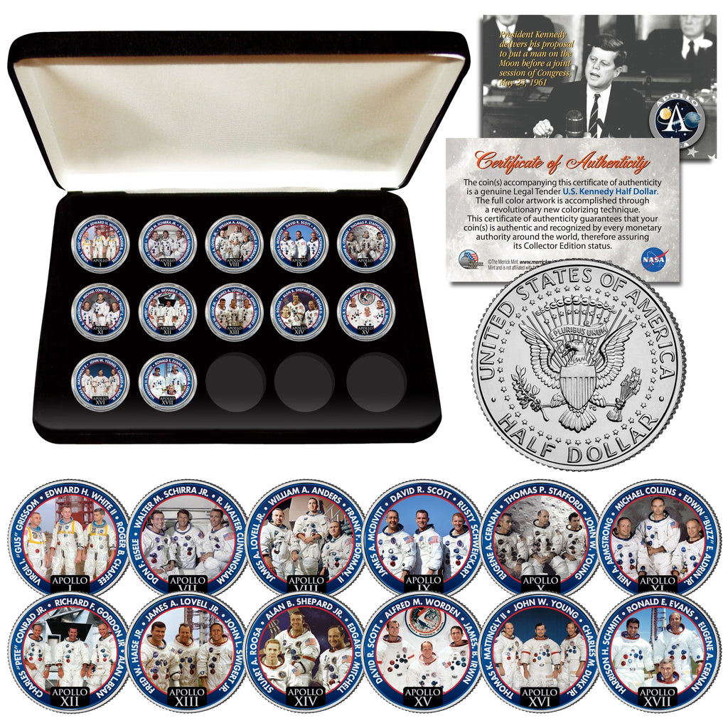 There were 12 Apollo Astronaut Crews in pursuit of President John F. Kennedy's national goal of "landing a man on the Moon and returning him safely to the Earth" by the end of the 1960s, which he proposed in a May 25, 1961 address to Congress. This APOLLO ASTRONAUT CREWS complete 12-coin set is a treasured collectible. Here is your chance to own beautifully colorized JFK Kennedy Half Dollar U.S. Coins. These high-quality genuine Legal Tender U.S. coins have been colorized using a unique painstaking multicolor authentic process. Colorizing coins involves the unique application of special inks directly to the surface of a coin that achieves a level of detail, color saturation, and durability that is #1 in the coin industry. The result is an everlasting colorized coin collectible of ultra-high quality. Each coin comes in a premium coin capsule. The set comes with a Certificate of Authenticity to guarantee that your coins are authentic and recognized by every monetary authority around the world, assuring its Collector Edition status.