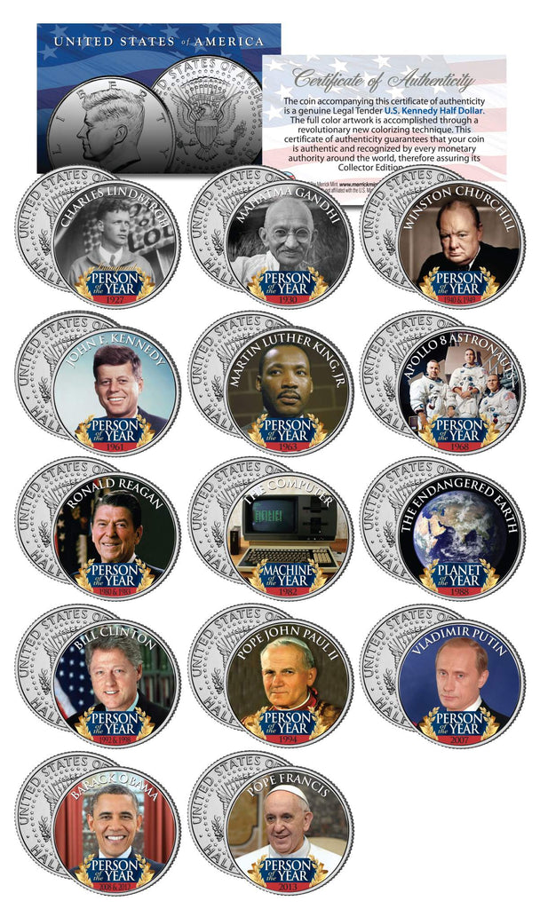 This PERSON OF THE YEAR complete 14-coin set is a treasured collectible, combining the influential with coin collecting. Here is your chance to own beautifully colorized JFK Kennedy Half Dollar U.S. Coins. These high-quality genuine Legal Tender U.S. coins have been colorized using a unique painstaking multicolor authentic process. Colorizing coins involves the unique application of special inks directly to the surface of a coin that achieves a level of detail, color saturation, and durability that is #1 in the coin industry. The result is an everlasting colorized coin collectible of ultra-high quality. Each coin comes in a premium coin capsule. The set comes with a Certificate of Authenticity to guarantee that your coins are authentic and recognized by every monetary authority around the world, assuring its Collector Edition status.