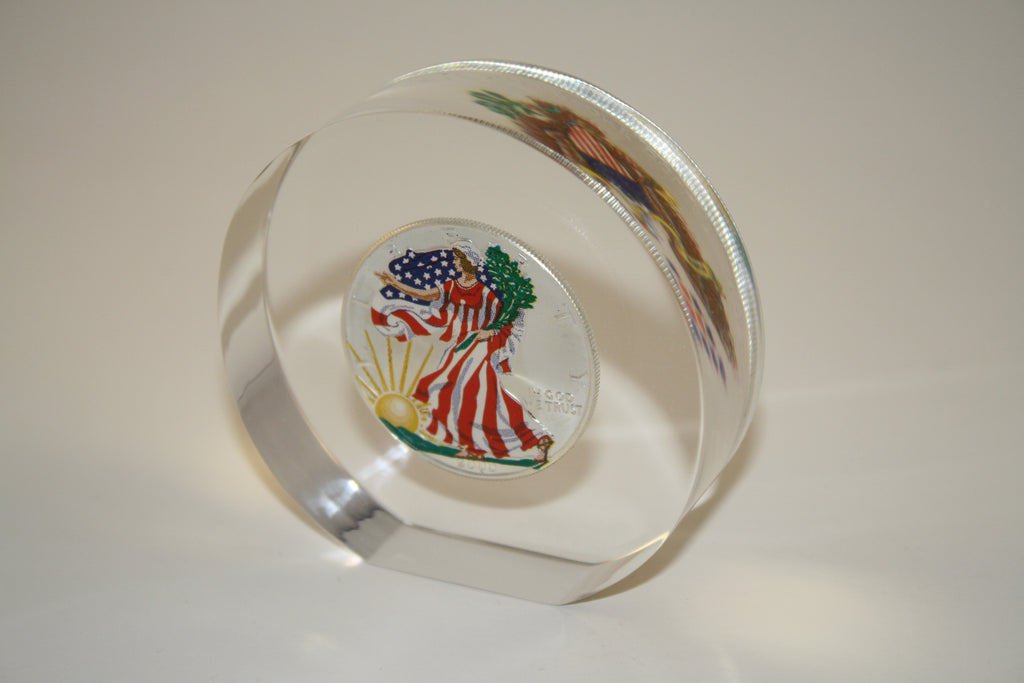 This collectible American Silver Eagle paperweight is near impossible to find. The beautiful colorized 2001 American Silver Eagle coin is permanently set in an acrylic Lucite paperweight, making it a magnificent display piece for your home or office. The coin is colorized on both sides. The colorized 2001 U.S. Silver Eagle Dollar is genuine legal tender struck by the U.S. Mint. It is minted in one full ounce of .999 PURE SILVER and measures 40.6mm in diameter. This brilliant uncirculated silver dollar has been enhanced by a unique colorization process. Coin inside this clear acrylic Lucite block gives it a 3D look, this is truly a piece you will cherish and share with all. The paperweight is 2-7/8” in height.