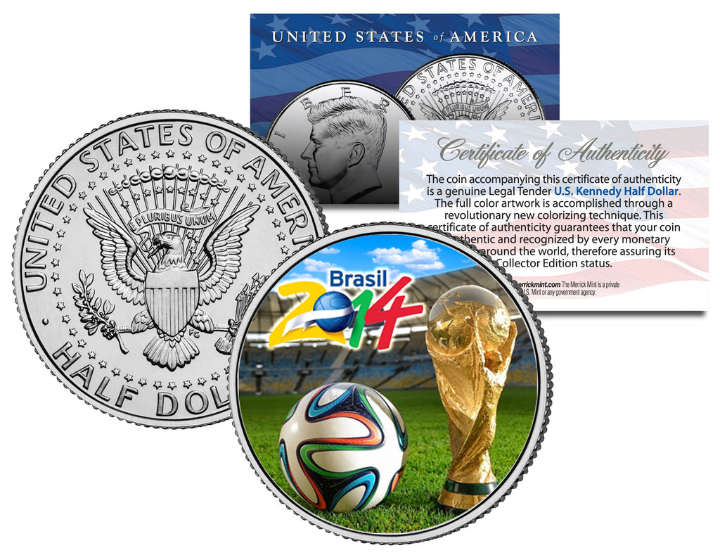 The World Cup is among the world's most widely viewed sporting events. This 2014 BRAZIL WORLD CUP coin is a treasured collectible, successfully combining soccer with coin collecting. This 2014 Test Promo coin is in extreme short supply. Here is your opportunity to own or to gift, a beautifully colorized 2014 JFK Kennedy Half Dollar U.S. Coin, which has been enhanced with a beautiful colorized image. Each coin comes in a premium coin capsule with a Certificate of Authenticity to guarantee that your coin is authentic and recognized by every monetary authority around the world, assuring its Collector Edition status. This Legal Tender United States coin has been colorized with an application of special inks directly to the surface of the coin, using a unique and painstakingly multicolor coin process, which achieves a level of detail, color saturation, and durability that is #1 in the coin industry. The result is an everlasting colorized coin collectible of ultra-high quality. The 2014 Kennedy half dollar is a U.S. fifty cent coin with coin mint marks chosen at random.