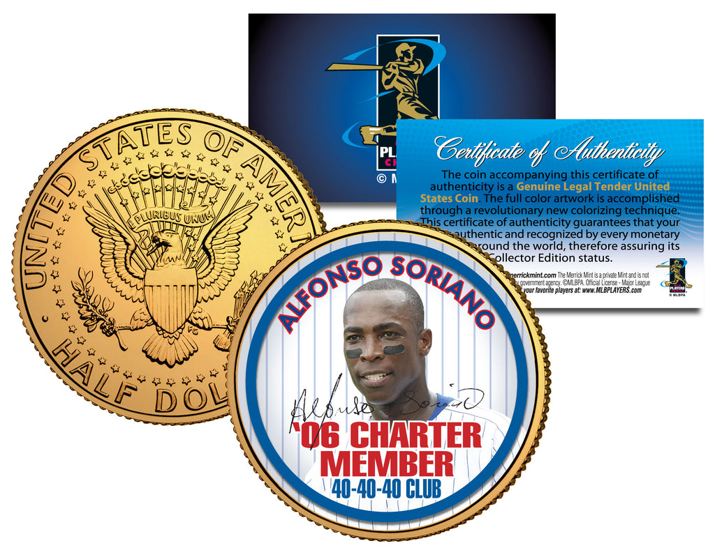 Alfonso Soriano is the only player in baseball history to have 40 or more home runs, stolen bases and doubles in a single season. This ALFONSO SORIANO ’06 CHARTER MEMBER 40-40-40 CLUB coin is a treasured collectible. Here is your chance to own or gift a beautifully colorized 24KT Gold Plated JFK Kennedy Half Dollar U.S. Coin. This high-quality genuine Legal Tender U.S. coin has been layered in Genuine 24 Karat Gold, and then enhanced with beautiful colorized images using a unique painstaking multicolor authentic process. Colorizing coins involves the unique application of special inks directly to the surface of a coin that achieves a level of detail, color saturation, and durability that is #1 in the coin industry. The result is an everlasting colorized coin collectible of ultra-high quality. Each coin comes in a premium coin capsule with a Certificate of Authenticity to guaranty that your coin is authentic and recognized by every monetary authority around the world, assuring its Collector Edition status. The Kennedy half dollar is a U.S. fifty cent coin with coin year and mint marks chosen at random.