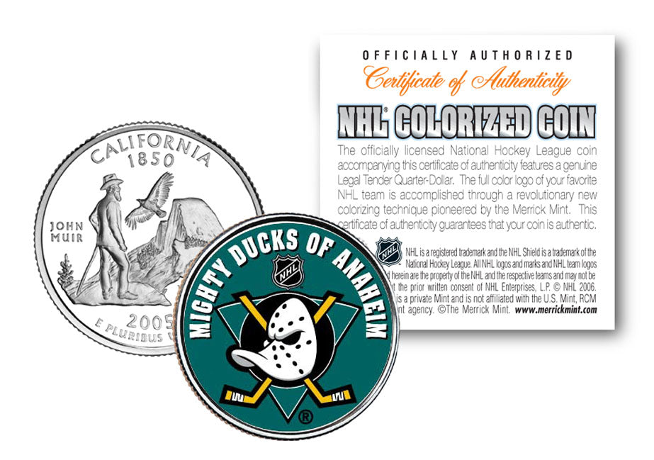 Here is your chance to own an OFFICIALLY LICENSED, beautifully colorized Legal Tender 2005 California Statehood Quarter U.S. coin that is beautifully colorized with the licensed NHL logo image of your favorite NHL team, the ANAHEIM DUCKS. Each coin is officially licensed and approved by the National Hockey League (NHL). This uncirculated Genuine Legal Tender Statehood Quarter U.S. Coin has been colorized using a unique multicolor authentic process by the Merrick Mint. Colorizing coins involves the unique application of special inks directly to the surface of a coin using a unique and painstakingly multi-color coin process, that achieves a level of detail, color saturation, and durability that is #1 in the industry. The result is an everlasting colorized coin collectible of ultra-high quality. Each uncirculated coin comes in a premium coin capsule with a NHL Certificate of Authenticity. Each Statehood Quarter coin features an emblematic design of the state on the reverse and colorized NHL team logo image on the obverse (portrait of George Washington design).