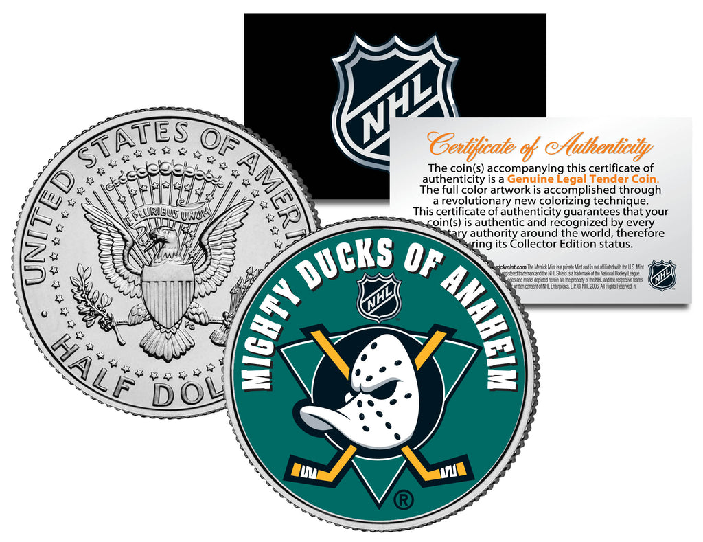 Here is your chance to own a JFK Kennedy Half Dollar U.S. coin that is beautifully colorized with the licensed NHL logo image of your favorite NHL team, the ANAHEIM DUCKS. Each coin is officially licensed and approved by the National Hockey League (NHL). This high-quality genuine Legal Tender U.S. coin has been colorized using a unique painstaking multicolor authentic process by the Merrick Mint. Colorizing coins involves the unique application of special inks directly to the surface of a coin that achieves a level of detail, color saturation, and durability that is #1 in the coin industry. The result is an everlasting colorized coin collectible of ultra-high quality. Each uncirculated coin comes in a premium coin capsule with a NHL Certificate of Authenticity. The Kennedy half dollar is a U.S. fifty cent coin with coin year and mint marks chosen at random.