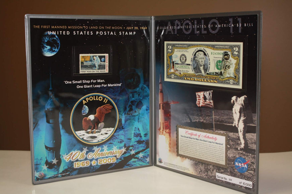 Includes Genuine Legal Tender Authentic FIRST MAN ON THE MOON $2 Bill. Includes Genuine 1969 FIRST MAN ON THE MOON U.S. Stamp. Special 40TH ANNIVERSARY APOLLO 11 1969-2009 Museum-Quality Folio. Built-in Manufacturer's Certificate of Authenticity. Measures 10.5" x 8.5" (closed) and 10.5” x17” (open). Limited Edition & Individually Serial Numbered of 10,000. Made in USA. Don’t Miss Your Chance to Order….Very Limited Quantity Available!