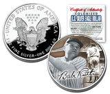 The officially licensed BABE RUTH colorized 2005 U.S. Silver Eagle Dollar coin is genuine legal tender struck by the U.S. Mint. It is minted in one full ounce of .999 PURE SILVER and measures a massive 40.6mm in diameter. This brilliant uncirculated silver dollar has been enhanced by a unique colorization process. Each coin comes in a premium coin capsule with a Certificate of Authenticity. Due to the age of the coin, there may be some toning which is a natural effect of .999 Pure Silver coins.