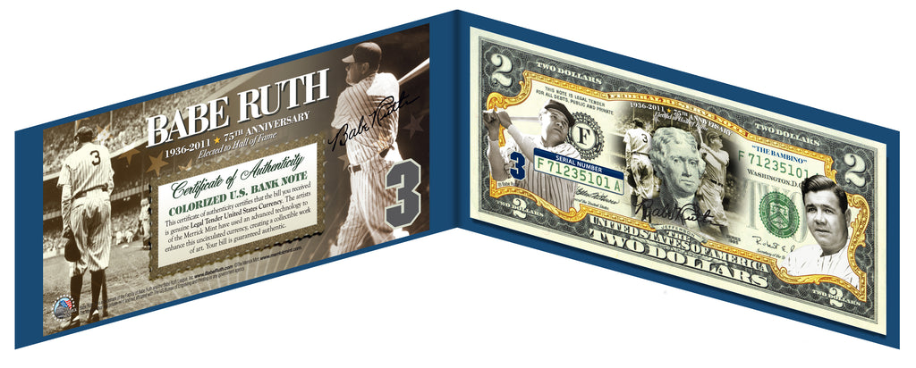 This uncirculated $2 Bill is Genuine Authentic Legal Tender of the United States, which has been enhanced with beautiful colorized images marking the 75th Anniversary of Babe Ruth being elected to the Hall of Fame. The full colorized images are accomplished through a revolutionary new authentic & genuine colorization process pioneered by The Merrick Mint. Included is a Certificate of Authenticity to guaranty that your bills are authentic and recognized by every monetary authority around the world, and assuring its Collector Edition status. Only genuine Legal Tender $2 United States Bills are used for this unique colorization process. Each $2 Bill is in FRESH, CRISP, UNCIRCULATED condition, and was directly removed from untouched wrapped Federal Reserve sealed packs. Former U.S. President Thomas Jefferson is featured on the obverse of the note, along with the special colorization overlay. The Signing of the Declaration of Independence by John Trumbull is featured on the reverse. It is the only U.S. Currency note that features two Presidents, John Adams and Thomas Jefferson, and it is one of the most rarely seen BILLS in circulation and actual use.