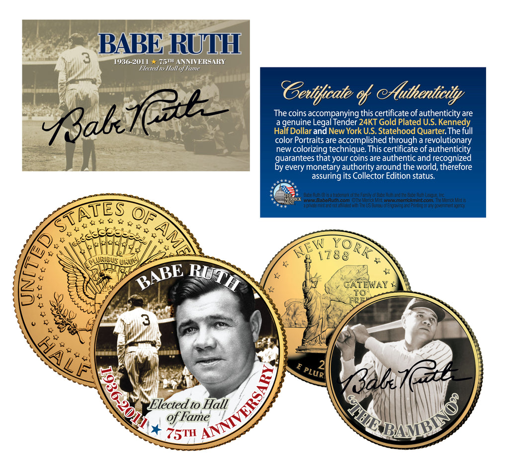 This Officially Licensed BABE RUTH 2-coin complete set is a treasured collectible, combining the popularity of Babe Ruth with coin collecting. Coins are Genuine Authentic Legal Tender of the United States, which have been layered in Genuine 24 Karat Gold, and then beautifully enhanced with colorized images. The 2-coin set includes an “Elected to Hall of Fame 75th Anniversary” 24-Karat Gold Plated JFK Kennedy Half Dollar coin plus a “The Bambino” 24-Karat Gold Plated 2001 New York Statehood quarter. Colorizing coins involves the unique application of special inks directly to the surface of a coin that achieves a level of detail, color saturation, and durability that is #1 in the coin industry. The result is an everlasting colorized coin collectible of ultra-high quality. Each coin comes in a premium coin capsule. The set comes with a Certificate of Authenticity to guarantee that your coins are authentic and recognized by every monetary authority around the world, assuring its Collector Edition status.