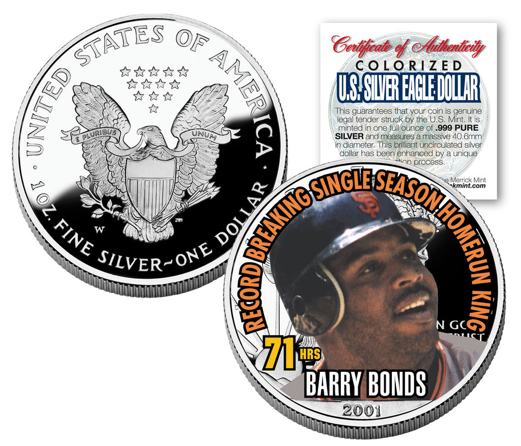 The officially licensed “BARRY BONDS – 71 HRS – RECORD BREAKING SINGLE SEASON” colorized 2001 U.S. Silver Eagle Dollar coin is genuine legal tender struck by the U.S. Mint. It is minted in one full ounce of .999 PURE SILVER and measures a massive 40.6mm in diameter. This brilliant uncirculated silver dollar has been enhanced by a unique colorization process. Each coin comes in a premium coin capsule with a Certificate of Authenticity. Due to the age of the coin, there may be some toning which is a natural effect of .999 Pure Silver coins.
