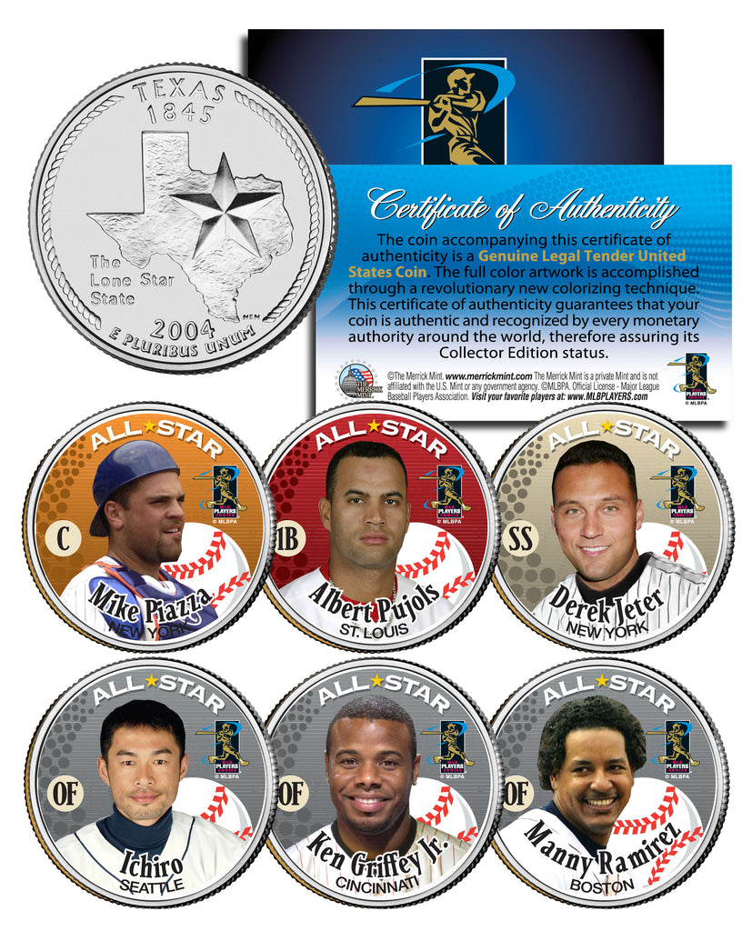 Here is your chance to own a complete set of six (6) colorized 2004 Texas Statehood Quarters U.S. Coins featuring 2004 BASEBALL ALL-STARS from the 2004 All-Star game played in Houston, Texas. The 6-coin set includes 2004 Baseball All-Stars: Mike Piazza, Albert Pujols, Derek Jeter, Ichiro, Ken Griffey Jr., Manny Ramirez. These high-quality, genuine Legal Tender United States coins have been colorized using a unique painstaking multicolor authentic process by the Merrick Mint. Colorizing coins involves the unique application of special inks directly to the surface of a coin that achieves a level of detail, color saturation, and durability that is #1 in the coin industry. The result is an everlasting colorized coin collectible of ultra-high quality. Each coin features an emblematic design of Texas State on the reverse and colorized images of Baseball’s 2004 All-Stars on the obverse (portrait of George Washington design). Each coin comes in a premium coin capsule. The 6-coin set comes with a Certificate of Authenticity to guaranty that your coins are authentic and recognized by every monetary authority around the world, assuring its Collector Edition status. REGULAR PRICE of these 6-coins is $42.00. GREAT SAVINGS BY BUYING HERE NOW!!!