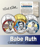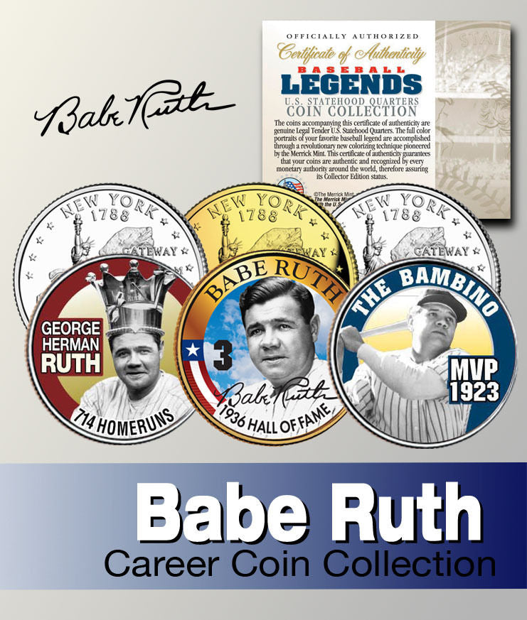 Here is your opportunity to own or to gift the BABE RUTH complete 3-coin set of colorized 2001 New York Statehood Quarters U.S. Coins, which have been enhanced with beautifully colorized images by the Merrick Mint. As a bonus, the Hall of Fame Quarter has been plated with 24K Gold. Each coin comes in a premium coin capsule. The complete 3-coin set comes with a full color Certificate of Authenticity. These Legal Tender United States coin have been colorized with an application of special inks directly to the surface of the coin, using a unique and painstakingly multicolor coin process, which achieves a level of detail, color saturation, and durability that is #1 in the coin industry. The result is an everlasting colorized coin collectible of ultra-high quality. Each Statehood Quarter coin features an emblematic design of New York State on the reverse and colorized image of Babe Ruth on the obverse (portrait of George Washington design).