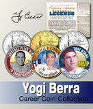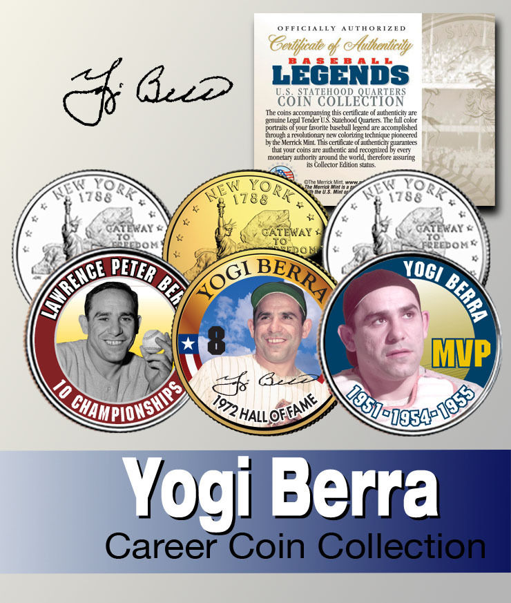 Here is your opportunity to own or to gift the YOGI BERRA complete 3-coin set of colorized 2001 New York Statehood Quarters U.S. Coins, which have been enhanced with beautifully colorized images by the Merrick Mint. As a bonus, the Hall of Fame Quarter has been plated with 24K Gold. Each coin comes in a premium coin capsule. The complete 3-coin set comes with a full color Certificate of Authenticity. These Legal Tender United States coin have been colorized with an application of special inks directly to the surface of the coin, using a unique and painstakingly multicolor coin process, which achieves a level of detail, color saturation, and durability that is #1 in the coin industry. The result is an everlasting colorized coin collectible of ultra-high quality. Each Statehood Quarter coin features an emblematic design of New York State on the reverse and colorized image of Yogi Berra on the obverse (portrait of George Washington design).