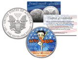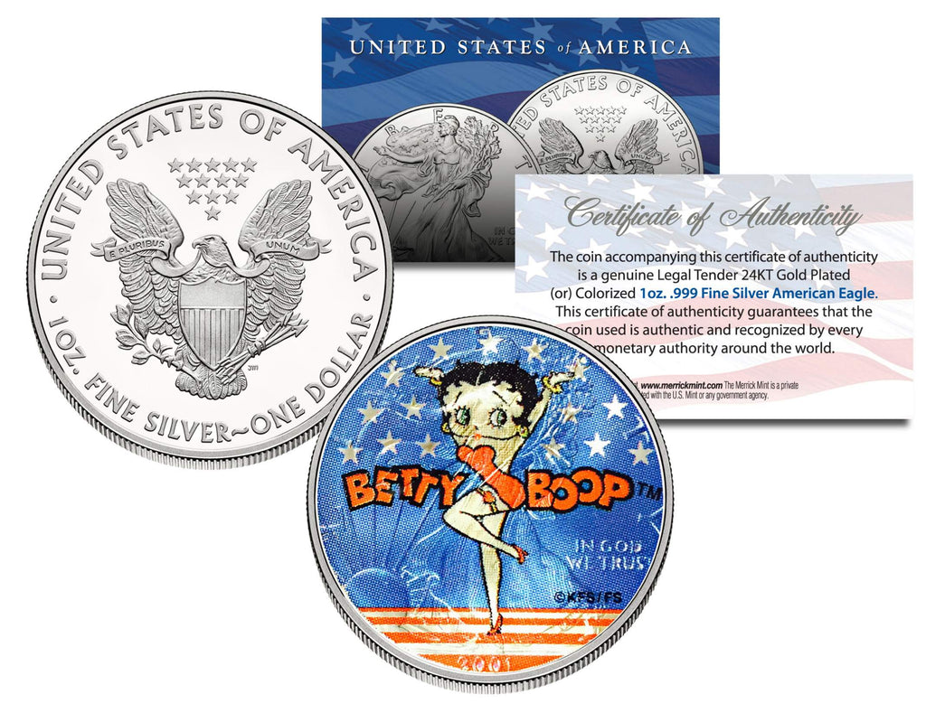 The officially licensed BETTY BOOP colorized 2001 U.S. Silver Eagle Dollar coin is genuine legal tender struck by the U.S. Mint. It is minted in one full ounce of .999 PURE SILVER and measures a massive 40.6mm in diameter. This brilliant uncirculated silver dollar has been enhanced by a unique colorization process. Each coin comes in a premium coin capsule with a Certificate of Authenticity. Due to the age of the coin, there may be some toning which is a natural effect of .999 Pure Silver coins.