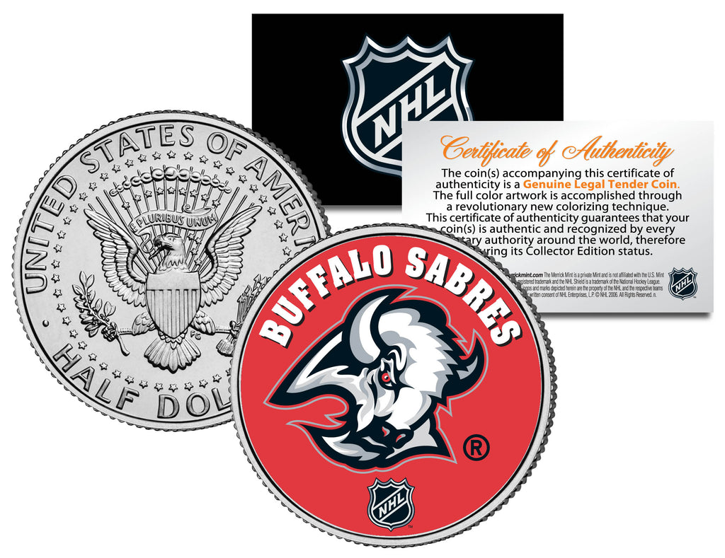 Here is your chance to own a JFK Kennedy Half Dollar U.S. coin that is beautifully colorized with the licensed NHL logo image of your favorite NHL team, the BUFFALO SABRES. Each coin is officially licensed and approved by the National Hockey League (NHL). This high-quality genuine Legal Tender U.S. coin has been colorized using a unique painstaking multicolor authentic process by the Merrick Mint. Colorizing coins involves the unique application of special inks directly to the surface of a coin that achieves a level of detail, color saturation, and durability that is #1 in the coin industry. The result is an everlasting colorized coin collectible of ultra-high quality. Each uncirculated coin comes in a premium coin capsule with a NHL Certificate of Authenticity. The Kennedy half dollar is a U.S. fifty cent coin with coin year and mint marks chosen at random.