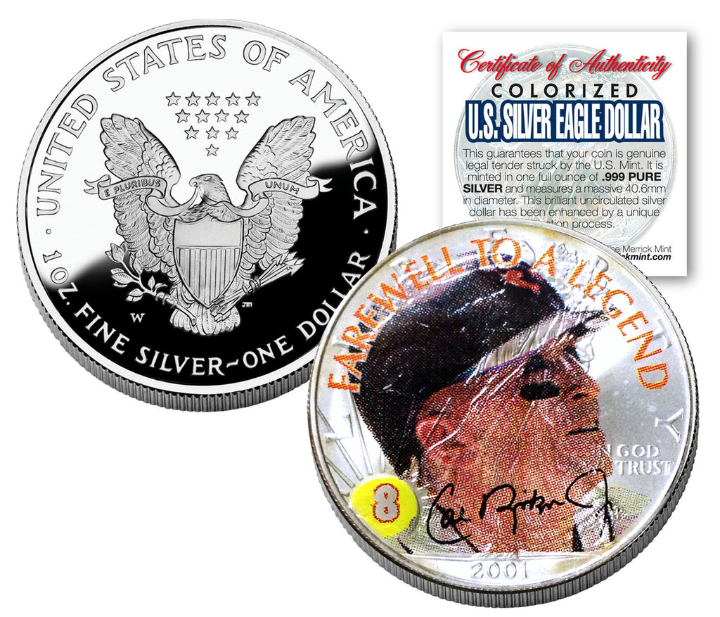 The officially licensed “CAL RIPKEN JR – FAREWELL TO A LEGEND” colorized 2001 U.S. Silver Eagle Dollar coin is genuine legal tender struck by the U.S. Mint. It is minted in one full ounce of .999 PURE SILVER and measures a massive 40.6mm in diameter. This brilliant uncirculated silver dollar has been enhanced by a unique colorization process. Each coin comes in a premium coin capsule with a Certificate of Authenticity. Due to the age of the coin, there may be some toning which is a natural effect of .999 Pure Silver coins.