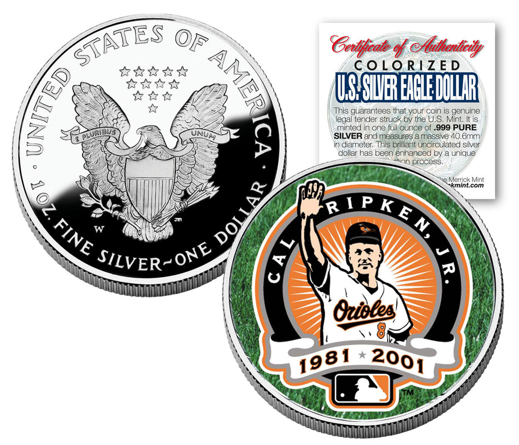 The officially licensed “CAL RIPKEN JR – RETIREMENT” colorized 2001 U.S. Silver Eagle Dollar coin is genuine legal tender struck by the U.S. Mint. It is minted in one full ounce of .999 PURE SILVER and measures a massive 40.6mm in diameter. This brilliant uncirculated silver dollar has been enhanced by a unique colorization process. Each coin comes in a premium coin capsule with a Certificate of Authenticity. Due to the age of the coin, there may be some toning which is a natural effect of .999 Pure Silver coins.