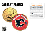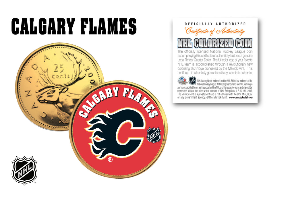Here is your chance to own an OFFICIALLY LICENSED, beautifully colorized LEGAL TENDER Canadian Quarter coin that is layered in Genuine 24 Karat Gold, and then beautifully colorized with the licensed NHL logo image of your favorite NHL team, the CALGARY FLAMES. Each 25-cent piece coin is officially licensed and approved by the National Hockey League (NHL). This Genuine Legal Tender Canadian Coin has been colorized using a unique multicolor authentic process. Colorizing coins involves the unique application of special inks directly to the surface of a coin using a unique and painstakingly multi-color coin process, that achieves a level of detail, color saturation, and durability that is #1 in the industry. The result is an everlasting colorized coin collectible of ultra-high quality. Each coin comes in a premium coin capsule with a NHL Certificate of Authenticity. Each coin features an obverse design of Queen Elizabeth II and reverse design of a caribou.
