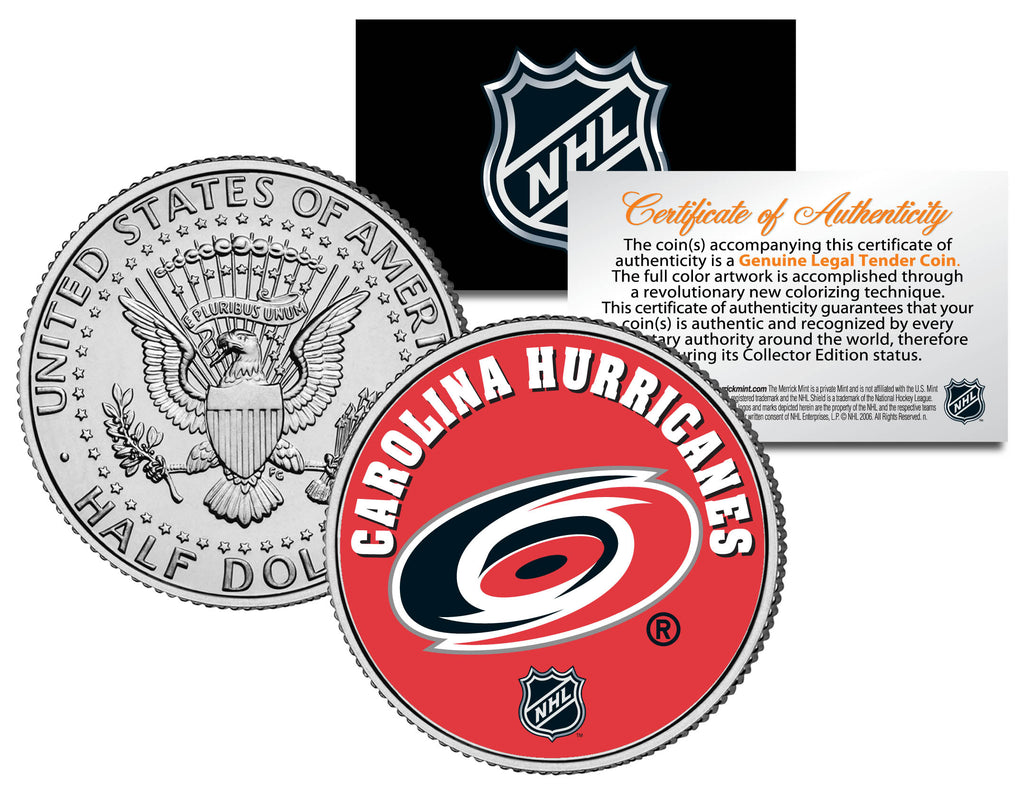 Here is your chance to own a JFK Kennedy Half Dollar U.S. coin that is beautifully colorized with the licensed NHL logo image of your favorite NHL team, the CAROLINA HURRICANES. Each coin is officially licensed and approved by the National Hockey League (NHL). This high-quality genuine Legal Tender U.S. coin has been colorized using a unique painstaking multicolor authentic process by the Merrick Mint. Colorizing coins involves the unique application of special inks directly to the surface of a coin that achieves a level of detail, color saturation, and durability that is #1 in the coin industry. The result is an everlasting colorized coin collectible of ultra-high quality. Each uncirculated coin comes in a premium coin capsule with a NHL Certificate of Authenticity. The Kennedy half dollar is a U.S. fifty cent coin with coin year and mint marks chosen at random.