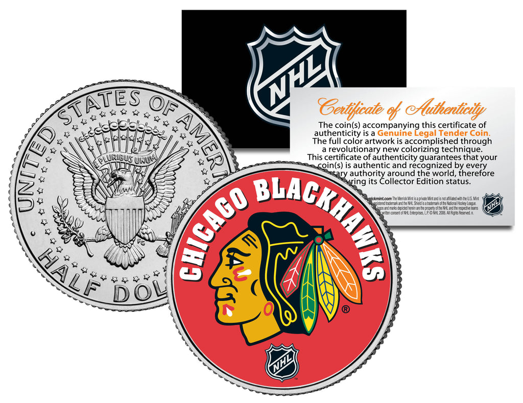 Here is your chance to own a JFK Kennedy Half Dollar U.S. coin that is beautifully colorized with the licensed NHL logo image of your favorite NHL team, the CHICAGO BLACKHAWKS. Each coin is officially licensed and approved by the National Hockey League (NHL). This high-quality genuine Legal Tender U.S. coin has been colorized using a unique painstaking multicolor authentic process by the Merrick Mint. Colorizing coins involves the unique application of special inks directly to the surface of a coin that achieves a level of detail, color saturation, and durability that is #1 in the coin industry. The result is an everlasting colorized coin collectible of ultra-high quality. Each uncirculated coin comes in a premium coin capsule with a NHL Certificate of Authenticity. The Kennedy half dollar is a U.S. fifty cent coin with coin year and mint marks chosen at random.