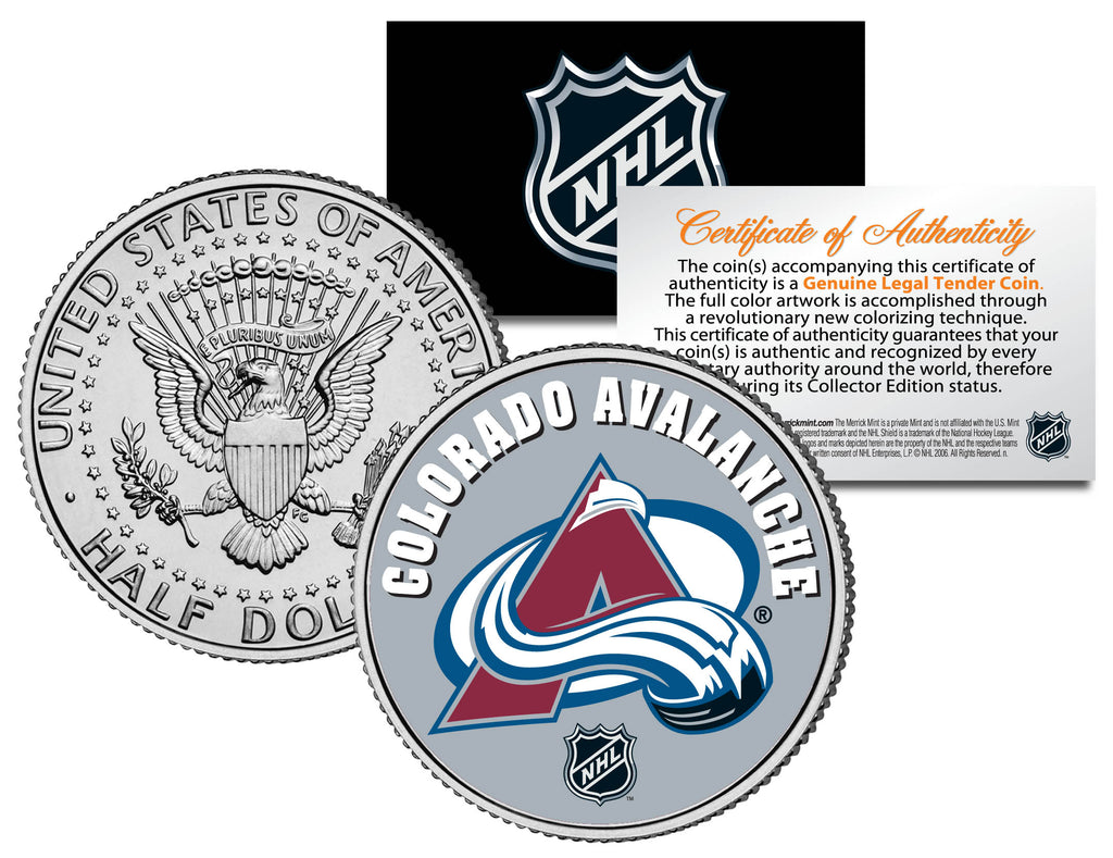 Here is your chance to own a JFK Kennedy Half Dollar U.S. coin that is beautifully colorized with the licensed NHL logo image of your favorite NHL team, the COLORADO AVALANCHE. Each coin is officially licensed and approved by the National Hockey League (NHL). This high-quality genuine Legal Tender U.S. coin has been colorized using a unique painstaking multicolor authentic process by the Merrick Mint. Colorizing coins involves the unique application of special inks directly to the surface of a coin that achieves a level of detail, color saturation, and durability that is #1 in the coin industry. The result is an everlasting colorized coin collectible of ultra-high quality. Each uncirculated coin comes in a premium coin capsule with a NHL Certificate of Authenticity. The Kennedy half dollar is a U.S. fifty cent coin with coin year and mint marks chosen at random.