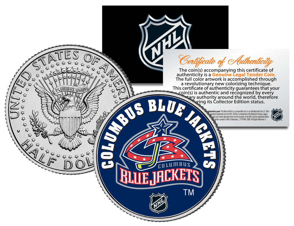 Here is your chance to own a JFK Kennedy Half Dollar U.S. coin that is beautifully colorized with the licensed NHL logo image of your favorite NHL team, the COLUMBUS BLUE JACKETS. Each coin is officially licensed and approved by the National Hockey League (NHL). This high-quality genuine Legal Tender U.S. coin has been colorized using a unique painstaking multicolor authentic process by the Merrick Mint. Colorizing coins involves the unique application of special inks directly to the surface of a coin that achieves a level of detail, color saturation, and durability that is #1 in the coin industry. The result is an everlasting colorized coin collectible of ultra-high quality. Each uncirculated coin comes in a premium coin capsule with a NHL Certificate of Authenticity. The Kennedy half dollar is a U.S. fifty cent coin with coin year and mint marks chosen at random.