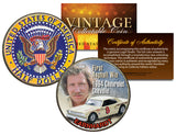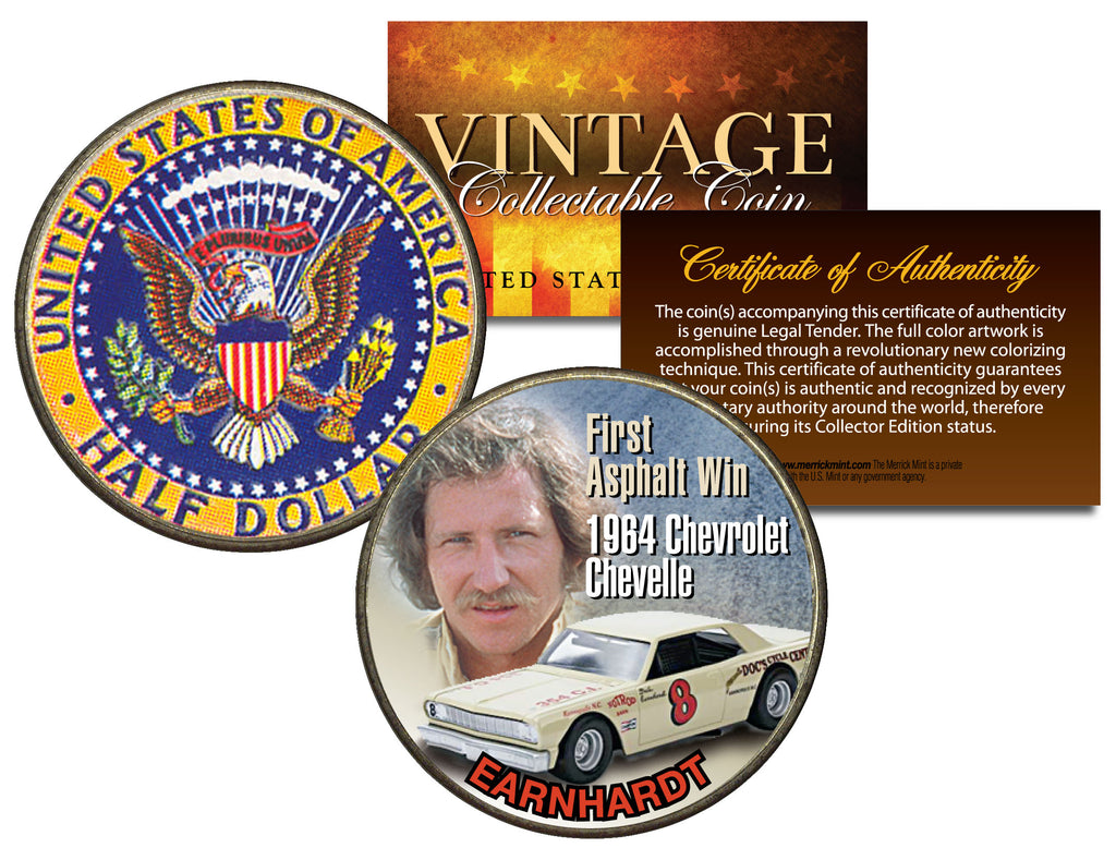 Here is your opportunity to own or gift the “EARNHARDT – First Asphalt Win – 1964 Chevrolet Chevelle” colorized 1964 JFK Kennedy Silver Half Dollar U.S. Coin, which has been enhanced with beautifully colorized images of Dale Earnhardt and his race car on the obverse side by the Merrick Mint. Each coin is beautifully enhanced in permanent full-color by the Merrick Mint to highlight the original reverse design. Each coin comes in a premium coin capsule with a full color Certificate of Authenticity. This Legal Tender United States coin has been colorized with an application of special inks directly to the surface of the coin, using a unique and painstakingly multicolor coin process, which achieves a level of detail, color saturation, and durability that is #1 in the coin industry. The result is an everlasting colorized coin collectible of ultra-high quality. Each coin features the left portrait of John F. Kennedy design on the obverse and a modified presidential seal design on the reverse. The 1964 Kennedy Silver half dollar is a U.S. fifty cent coin with mint marks chosen at random.