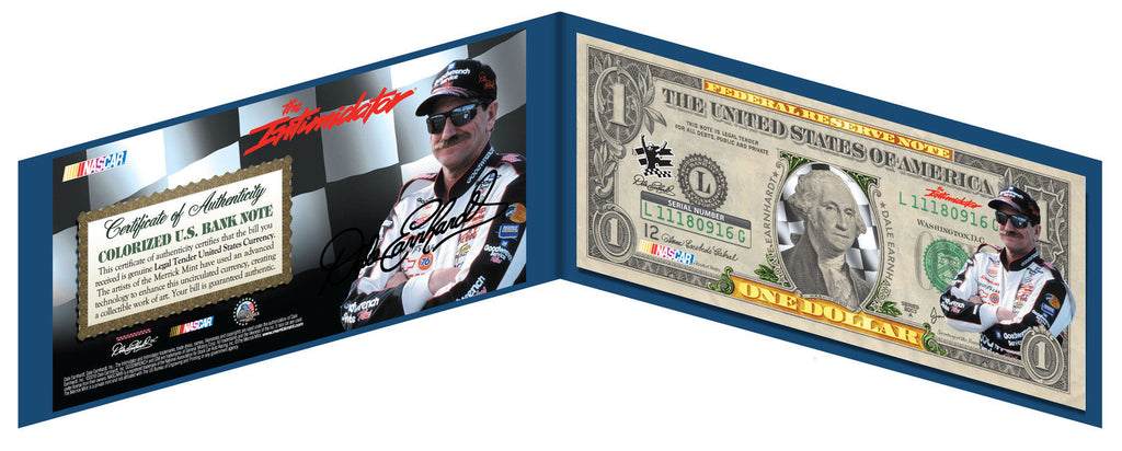 This uncirculated $1 Bill is Genuine Authentic Legal Tender of the United States, which has been enhanced with beautiful colorized images of Dale Earnhardt Sr.. The full colorized images are accomplished through a revolutionary new authentic & genuine colorization process pioneered by The Merrick Mint. Included is a Certificate of Authenticity to guaranty that your bills are authentic and recognized by every monetary authority around the world, and assuring its Collector Edition status. Only genuine Legal Tender $1 United States Bills are used for this unique colorization process. Each $1 Bill is in FRESH, CRISP, UNCIRCULATED condition, and was directly removed from untouched wrapped Federal Reserve sealed packs. The first US President, George Washington, is featured on the obverse of the note, along with the special hologram overlay and the Great Seal of the United States is featured on the reverse.