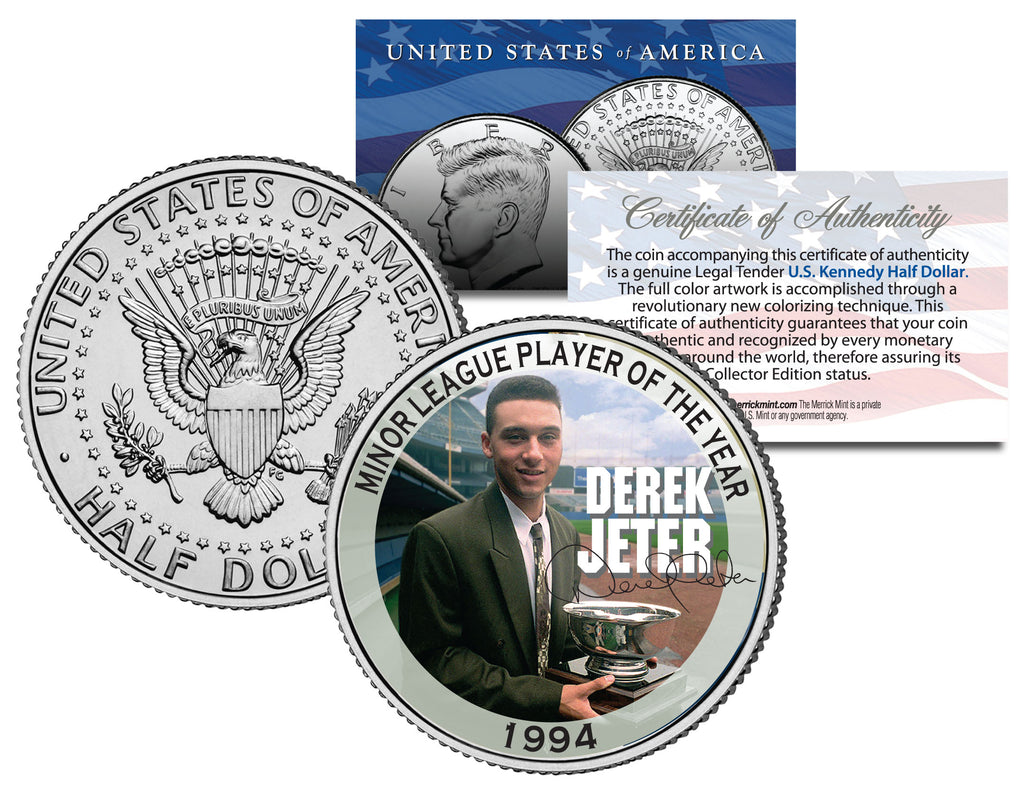 Derek Jeter won Minor League Player of the Year award in 1994. Here is your opportunity to own or to gift the “DEREK JETER - 1994 - MINOR LEAGUE PLAYER OF THE YEAR” colorized 1994 JFK Kennedy Half Dollar U.S. Coin, which has been enhanced with a beautifully colorized image by the Merrick Mint. Each coin comes in a premium coin capsule with a full color Certificate of Authenticity. This Legal Tender United States coin has been colorized with an application of special inks directly to the surface of the coin, using a unique and painstakingly multicolor coin process, which achieves a level of detail, color saturation, and durability that is #1 in the coin industry. The result is an everlasting colorized coin collectible of ultra-high quality. The 1994 Kennedy half dollar is a U.S. fifty cent coin with mint marks chosen at random.