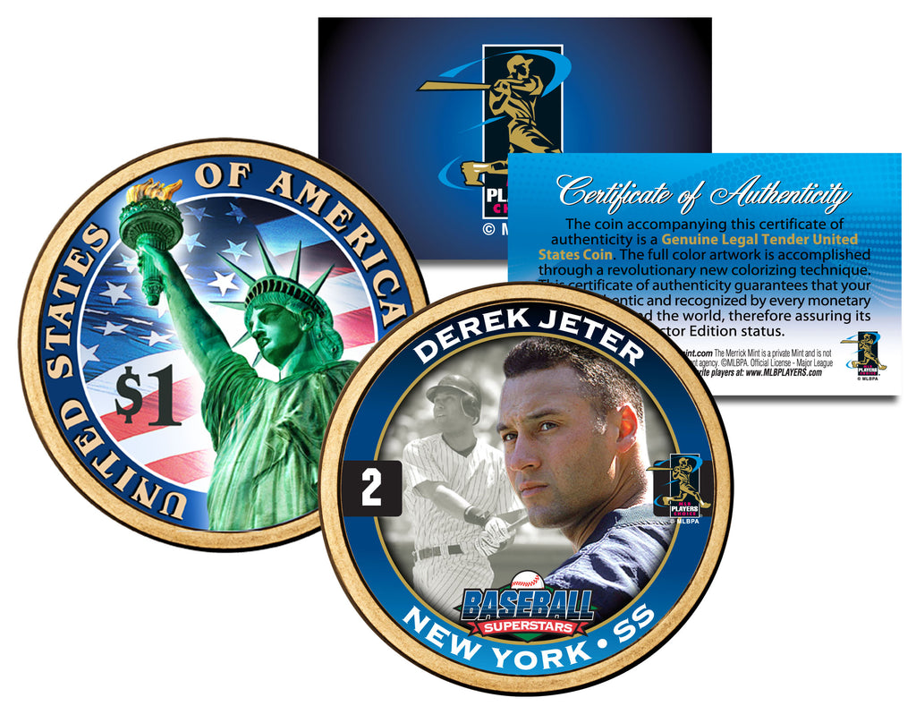 Here is your opportunity to own or to gift the DEREK JETER – BASEBALL SUPERSTARS colorized Inaugural George Washington 2007 Presidential $1 U.S. Coin. The obverse of the coin has been beautifully colorized with images of Derek Jeter. To highlight the original design on the coin reverse, the Merrick Mint has colorized the Statue of Liberty design. Each coin comes in a premium coin capsule with a full color Certificate of Authenticity to guarantee that your coin is authentic and recognized by every monetary authority around the world, assuring its Collector Edition status. This Legal Tender United States coin has been colorized with an application of special inks directly to the surface of the coin, using a unique and painstakingly multicolor coin process, which achieves a level of detail, color saturation, and durability that is #1 in the coin industry. The result is an everlasting colorized coin collectible of ultra-high quality. The inaugural George Washington 2007 Presidential $1 U.S. Coin features a Statue of Liberty design on the reverse and a George Washington portrait design on the obverse.