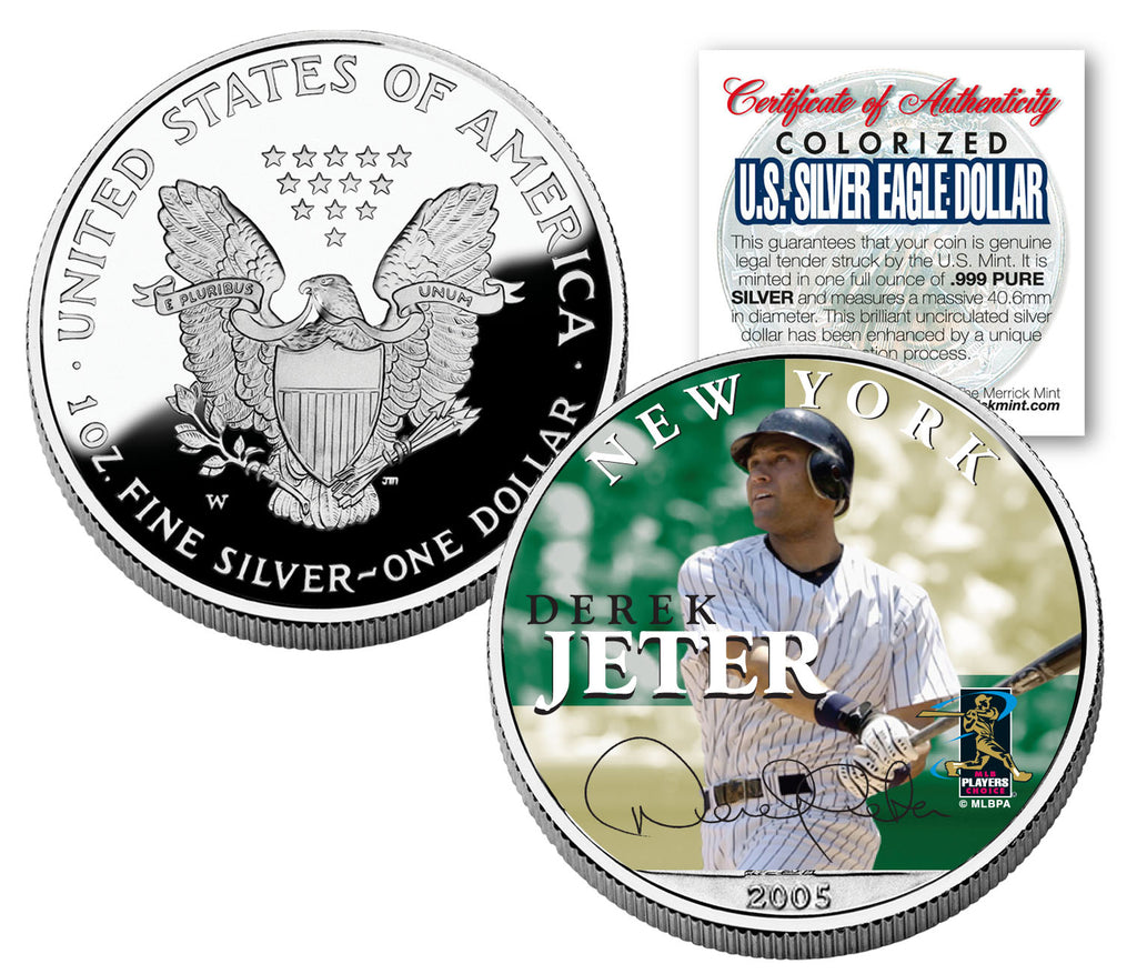 The officially licensed DEREK JETER colorized 2005 U.S. Silver Eagle Dollar coin is genuine legal tender struck by the U.S. Mint. It is minted in one full ounce of .999 PURE SILVER and measures a massive 40.6mm in diameter. This brilliant uncirculated silver dollar has been enhanced by a unique colorization process. Each coin comes in a premium coin capsule with a Certificate of Authenticity. Due to the age of the coin, there may be some toning which is a natural effect of .999 Pure Silver coins.