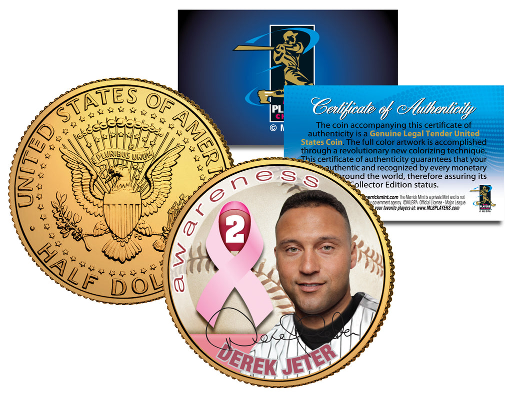 This Derek Jeter coin is for Breast Cancer Awareness. Here is your chance to own or gift a beautifully colorized 24KT Gold Plated JFK Kennedy Half Dollar U.S. Coin. This high-quality genuine Legal Tender U.S. coin has been layered in Genuine 24 Karat Gold, and then enhanced with beautiful colorized images using a unique painstaking multicolor authentic process. Colorizing coins involves the unique application of special inks directly to the surface of a coin that achieves a level of detail, color saturation, and durability that is #1 in the coin industry. The result is an everlasting colorized coin collectible of ultra-high quality. Each coin comes in a premium coin capsule with a Certificate of Authenticity to guaranty that your coin is authentic and recognized by every monetary authority around the world, assuring its Collector Edition status. The Kennedy half dollar is a U.S. fifty cent coin with coin year and mint marks chosen at random.