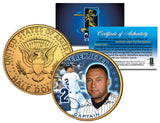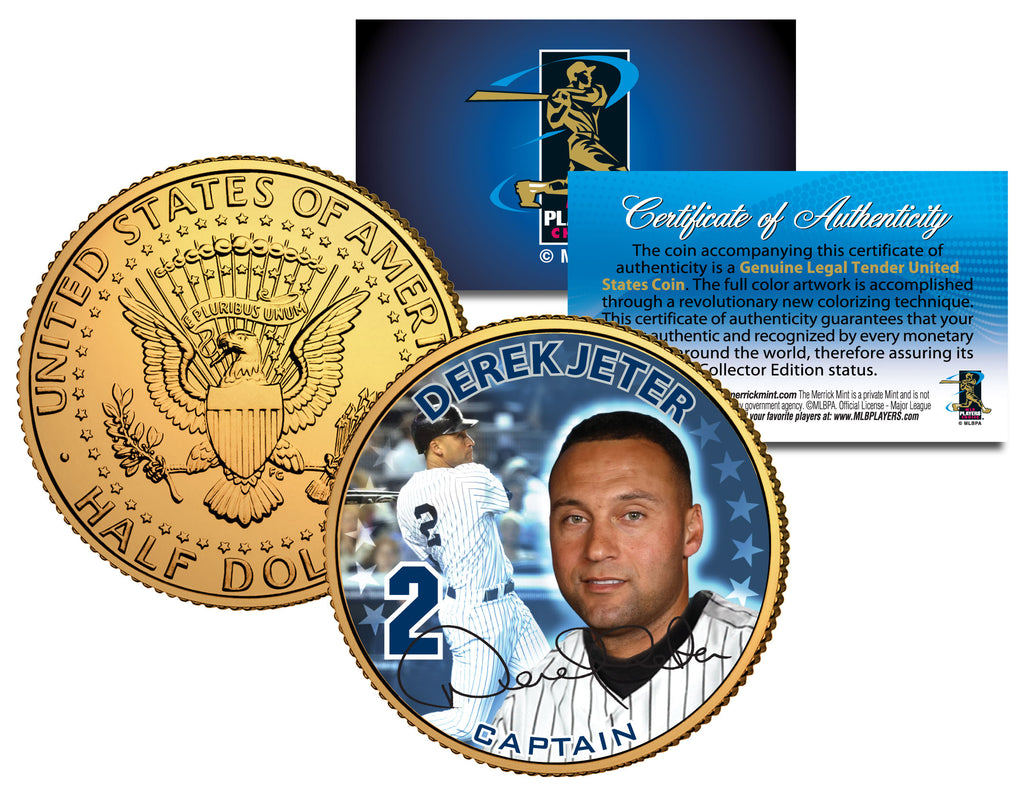 This DEREK JETER - CAPTAIN coin is a treasured collectible. Here is your chance to own or gift a beautifully colorized 24KT Gold Plated JFK Kennedy Half Dollar U.S. Coin. This high-quality genuine Legal Tender U.S. coin has been layered in Genuine 24 Karat Gold, and then enhanced with beautiful colorized images using a unique painstaking multicolor authentic process. Colorizing coins involves the unique application of special inks directly to the surface of a coin that achieves a level of detail, color saturation, and durability that is #1 in the coin industry. The result is an everlasting colorized coin collectible of ultra-high quality. Each coin comes in a premium coin capsule with a Certificate of Authenticity to guaranty that your coin is authentic and recognized by every monetary authority around the world, assuring its Collector Edition status. The Kennedy half dollar is a U.S. fifty cent coin with coin year and mint marks chosen at random.