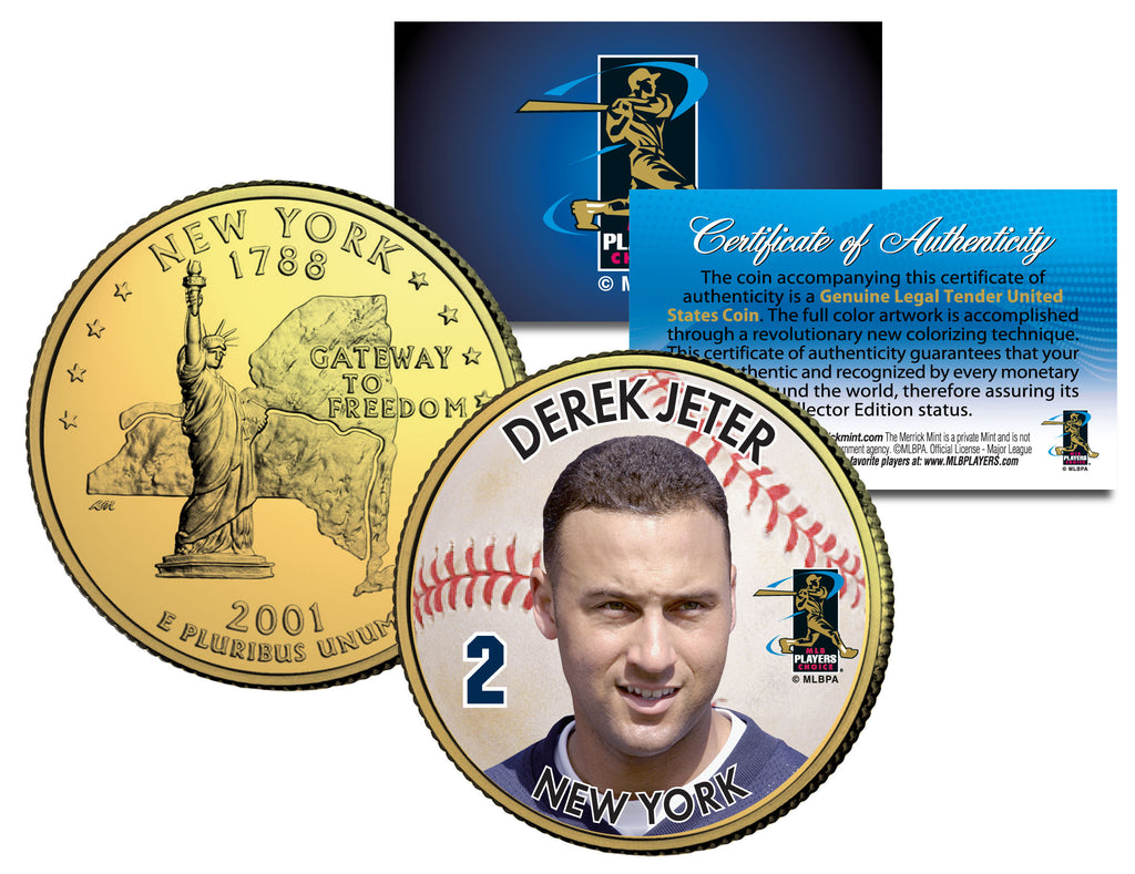 This DEREK JETER coin is a treasured collectible, successfully combining baseball with coin collecting. Here is your chance to own or gift a beautifully colorized 24KT Gold Plated 2001 New York Statehood Quarter U.S. Coin. This high-quality genuine Legal Tender U.S. coin has been layered in Genuine 24 Karat Gold, and then enhanced with a beautiful colorized image using a unique painstaking multicolor authentic process. Each coin comes in a premium coin capsule with a Certificate of Authenticity to guarantee that your coin is authentic and recognized by every monetary authority around the world, assuring its Collector Edition status. Colorizing coins involves the unique application of special inks directly to the surface of a coin that achieves a level of detail, color saturation, and durability that is #1 in the coin industry. The result is an everlasting colorized coin collectible of ultra-high quality. Each 24KT Gold Plated coin features an emblematic design of New York State on the reverse and a colorized image of a Derek Jeter on the obverse (portrait of George Washington design).