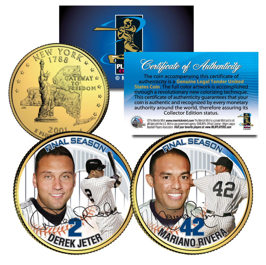 Here is your chance to own a complete set of two (2) 24KT Gold Plated and colorized 2001 New York Statehood Quarters U.S. Coins featuring DEREK JETER & MARIANO RIVERA, in this Limited Edition FINAL SEASON Coin Series. These high-quality, genuine Legal Tender United States coins have been layered in Genuine 24 Karat Gold, and then colorized using a unique painstaking multicolor authentic process by the Merrick Mint. Colorizing coins involves the unique application of special inks directly to the surface of a coin that achieves a level of detail, color saturation, and durability that is #1 in the coin industry. The result is an everlasting colorized coin collectible of ultra-high quality. Each 24KT Gold Plated coin features an emblematic design of New York State on the reverse and colorized images of the player on the obverse (portrait of George Washington design). Each coin comes in a premium coin capsule. The 2-coin set comes with a Certificate of Authenticity to guarantee that your coins are authentic and recognized by every monetary authority around the world, assuring their Collector Edition status.