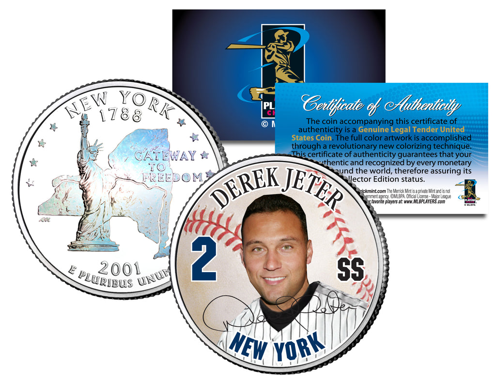 Here is your chance to own a very rare Derek Jeter coin that was a random insert from the 2007 Merrick Mint Colorized Statehood Baseball Quarters foil pack box series. What distinguishes this coin as a rare insert coin is the hologram reverse of the coin. The regular Derek Jeter coin of this series does not have the hologram reverse. This beautifully colorized uncirculated LEGAL TENDER 2001 NEW YORK Statehood Quarter U.S. coin is beautifully colorized with a Derek Jeter image on the obverse using a unique multicolor authentic process by the Merrick Mint. Colorizing coins involves the unique application of special inks directly to the surface of a coin using a unique and painstakingly multi-color coin process, that achieves a level of detail, color saturation, and durability that is #1 in the industry. The result is an everlasting colorized coin collectible of ultra-high quality. Each coin comes in a premium coin capsule with a Certificate of Authenticity to guaranty that your coin is authentic and recognized by every monetary authority around the world, assuring its Collector Edition status.