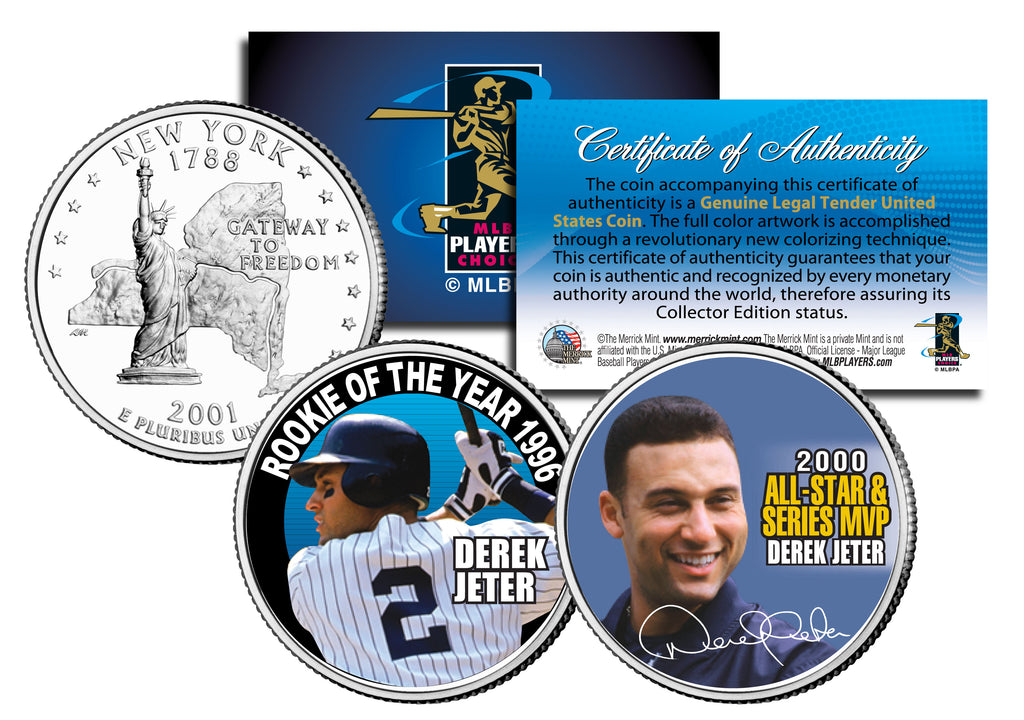 Here is your chance to own a complete set of two (2) colorized 2001 New York Statehood Quarters U.S. Coins featuring DEREK JETER. The 2-coin set includes: a “ROOKIE OF THE YEAR 1996 – DEREK JETER” coin plus a “2000 ALL-STAR & SERIES MVP – DEREK JETER” coin. These high-quality, genuine Legal Tender United States coins have been colorized using a unique painstaking multicolor authentic process by the Merrick Mint. Colorizing coins involves the unique application of special inks directly to the surface of a coin that achieves a level of detail, color saturation, and durability that is #1 in the coin industry. The result is an everlasting colorized coin collectible of ultra-high quality. Each coin features an emblematic design of New York State on the reverse and colorized images of DEREK JETER on the obverse (portrait of George Washington design). Each coin comes in a premium coin capsule. The 2-coin set comes with a Certificate of Authenticity to guaranty that your coins are authentic and recognized by every monetary authority around the world, assuring its Collector Edition status.