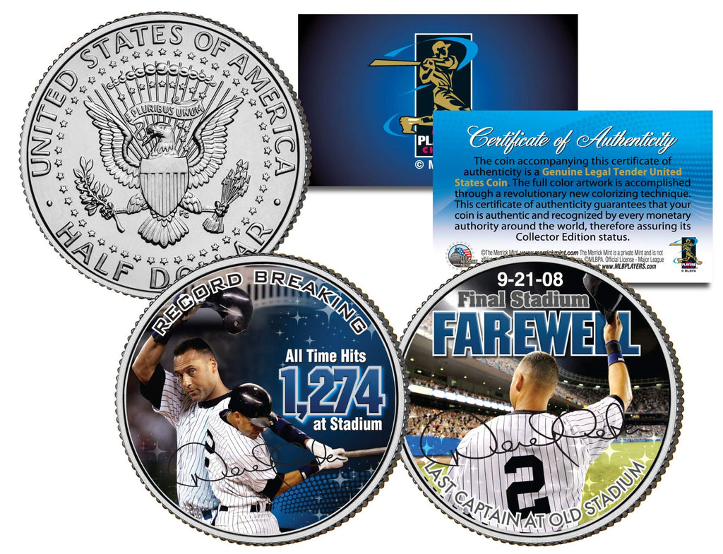Here is your chance to own a complete set of two (2) colorized JFK Kennedy Half Dollar U.S. Coins featuring DEREK JETER, in this Limited Edition OLD YANKEE STADIUM FAREWELL Coin Series. The 2-coin set includes: “Record Breaking 1,274 All Time Hits at Stadium” coin plus “Final Stadium Farewell 9-21-08 Last Captain at Old Stadium” coin. These high-quality, genuine Legal Tender United States coins have been colorized using a unique painstaking multicolor authentic process by the Merrick Mint. Colorizing coins involves the unique application of special inks directly to the surface of a coin that achieves a level of detail, color saturation, and durability that is #1 in the coin industry. The result is an everlasting colorized coin collectible of ultra-high quality. Each coin comes in a premium coin capsule. The 2-coin set comes with a Certificate of Authenticity to guarantee that your coins are authentic and recognized by every monetary authority around the world, assuring its Collector Edition status. The Kennedy half dollar is a U.S. fifty cent coin with coin year and mint marks chosen at random.