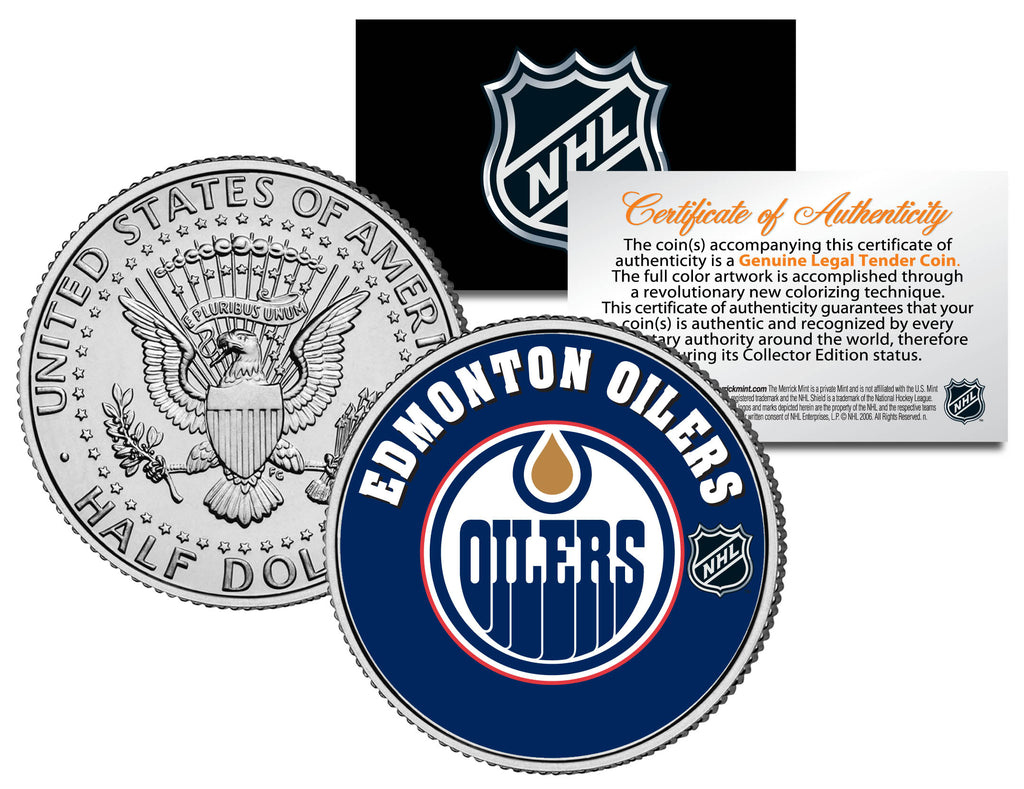 Here is your chance to own a JFK Kennedy Half Dollar U.S. coin that is beautifully colorized with the licensed NHL logo image of your favorite NHL team, the EDMONTON OILERS. Each coin is officially licensed and approved by the National Hockey League (NHL). This high-quality genuine Legal Tender U.S. coin has been colorized using a unique painstaking multicolor authentic process by the Merrick Mint. Colorizing coins involves the unique application of special inks directly to the surface of a coin that achieves a level of detail, color saturation, and durability that is #1 in the coin industry. The result is an everlasting colorized coin collectible of ultra-high quality. Each uncirculated coin comes in a premium coin capsule with a NHL Certificate of Authenticity. The Kennedy half dollar is a U.S. fifty cent coin with coin year and mint marks chosen at random.