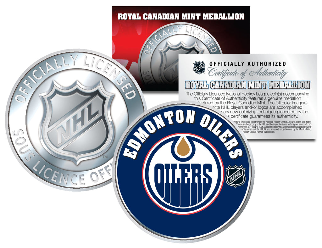 Here is your chance to own an OFFICIALLY LICENSED Royal Canadian Mint NHL Medallion which is beautifully colorized with the licensed NHL logo image of your favorite NHL team, the EDMONTON OILERS. Each medallion is officially licensed and approved by the National Hockey League (NHL). This officially licensed medallion has been colorized using a unique multicolor authentic process by the Merrick Mint. Colorizing medallions involves the unique application of special inks directly to the surface using a unique and painstakingly multi-color process, that achieves a level of detail, color saturation, and durability that is #1 in the industry. Each medallion comes in a coin capsule with a NHL Certificate of Authenticity. Each medallion is about the same size as a U.S. Half Dollar coin and features a NHL logo with English and French wording design on the reverse and a colorized NHL team logo image on the obverse.