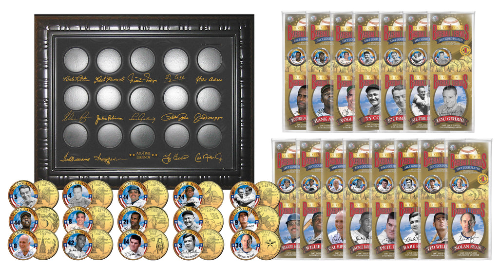 This 2006 GOLDEN BASEBALL LEGENDS 15-coin complete set is a treasured collectible, successfully combining baseball with coin collecting. This hard-to-find, cello-packed collectible was only available as a WALGREENS promotion. Each coin comes in a premium coin capsule with a Certificate of Authenticity to guarantee that your coin is authentic and recognized by every monetary authority around the world, assuring its Collector Edition status. This 15-coin complete set comes with a beautiful 15-coin display. Each statehood quarter has been layered in Genuine 24 Karat Gold, and then enhanced with a beautiful colorized player image by the Merrick Mint. Each Golden Baseball Legend coin is matched to the player’s team Statehood Quarter. These Legal Tender United States coins have been colorized with an application of special inks directly to the surface of the coin, using a unique and painstakingly multicolor coin process, which achieves a level of detail, color saturation, and durability that is #1 in the coin industry. The result is an everlasting colorized coin collectible of ultra-high quality. Each Statehood Quarter coin features an emblematic design of the state on the reverse and colorized player image on the obverse (portrait of George Washington design).