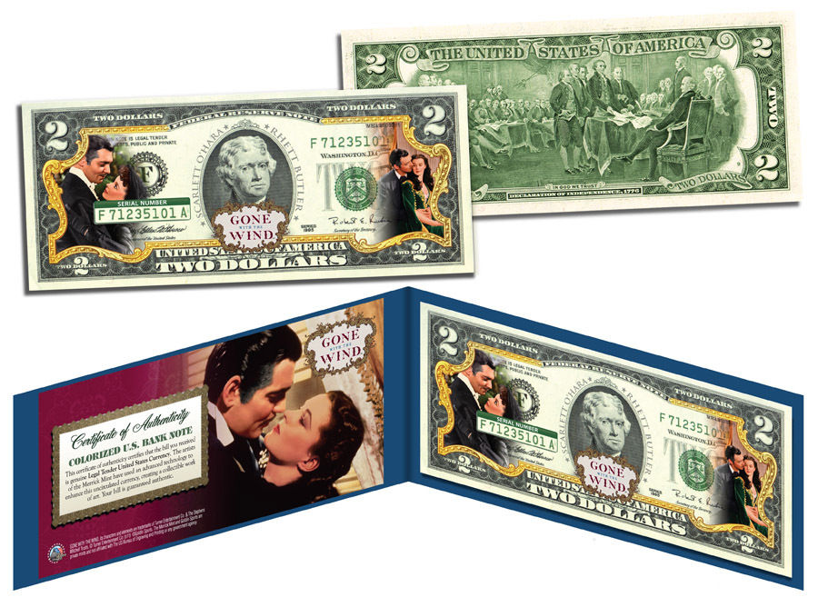 This GONE WITH THE WIND uncirculated $2 Bill is Genuine Authentic Legal Tender of the United States, which has been enhanced with beautiful colorized images from the epic film. The full colorized images are accomplished through a revolutionary new authentic & genuine colorization process pioneered by The Merrick Mint. Included is a Certificate of Authenticity to guarantee that your bills are authentic and recognized by every monetary authority around the world, and assuring its Collector Edition status. Only genuine Legal Tender $2 United States Bills are used for this unique colorization process. Each $2 Bill is in FRESH, CRISP, UNCIRCULATED condition, and was directly removed from untouched wrapped Federal Reserve sealed packs. Former U.S. President Thomas Jefferson is featured on the obverse of the note, along with the special colorization overlay. The Signing of the Declaration of Independence by John Trumbull is featured on the reverse. It is the only U.S. Currency note that features two Presidents, John Adams and Thomas Jefferson, and it is one of the most rarely seen BILLS in circulation and actual use.