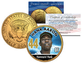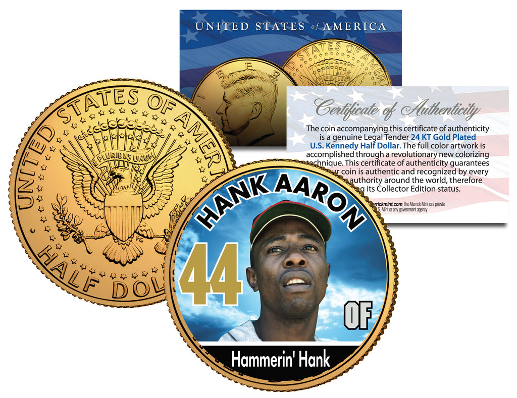 This BASEBALL LEGENDS – HANK AARON “Hammerin’ Hank 44 OF” coin is a treasured collectible, successfully combining baseball with coin collecting. Here is your opportunity to own or to gift, a beautifully colorized JFK Kennedy Half Dollar U.S. Coin, which has been layered in Genuine 24 Karat Gold, and then enhanced with a beautiful colorized image by the Merrick Mint. Each coin comes in a premium coin capsule with a full color Certificate of Authenticity. This Legal Tender United States coin has been colorized with an application of special inks directly to the surface of the coin, using a unique and painstakingly multicolor coin process, which achieves a level of detail, color saturation, and durability that is #1 in the coin industry. The result is an everlasting colorized coin collectible of ultra-high quality. The Kennedy half dollar is a U.S. fifty cent coin with coin year and mint marks chosen at random.