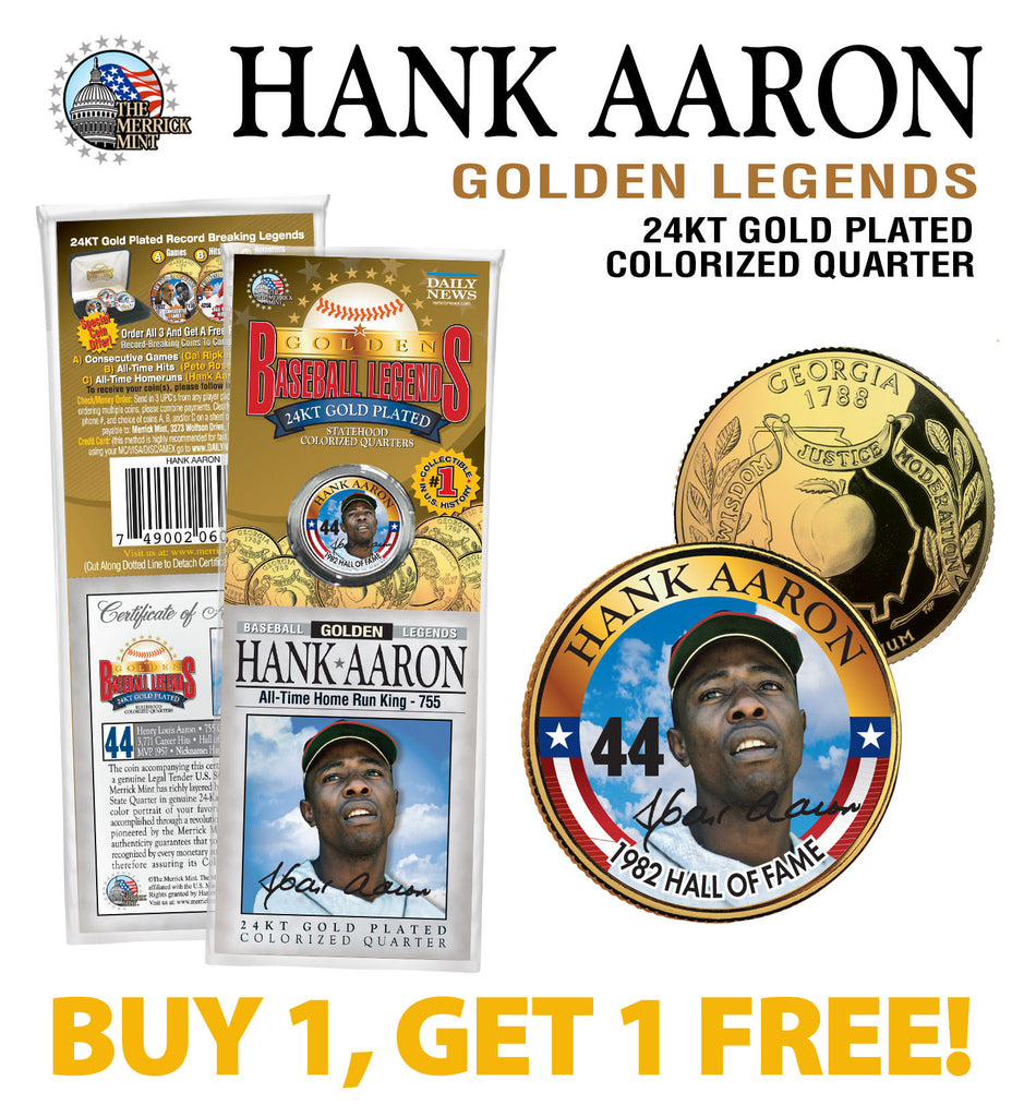 Buy one and get one FREE! This GOLDEN BASEBALL LEGENDS – HANK AARON “1982 HALL OF FAME 44" coin is a treasured collectible, successfully combining baseball with coin collecting. Here is your opportunity to own or to gift, a beautifully colorized 1999 Georgia Quarter U.S. coin, which has been layered in Genuine 24 Karat Gold, and then enhanced with a beautiful colorized image by the Merrick Mint. This hard-to-find, cello-packed collectible was only available as a NY Daily News newspaper promotion. Each coin comes in a premium coin capsule with a Certificate of Authenticity to guaranty that your coin is authentic and recognized by every monetary authority around the world, assuring its Collector Edition status. This Legal Tender United States coin has been colorized with an application of special inks directly to the surface of the coin, using a unique and painstakingly multicolor coin process, which achieves a level of detail, color saturation, and durability that is #1 in the coin industry. The result is an everlasting colorized coin collectible of ultra-high quality. Each Statehood Quarter coin features an emblematic design of the state on the reverse and colorized player image on the obverse (portrait of George Washington design).