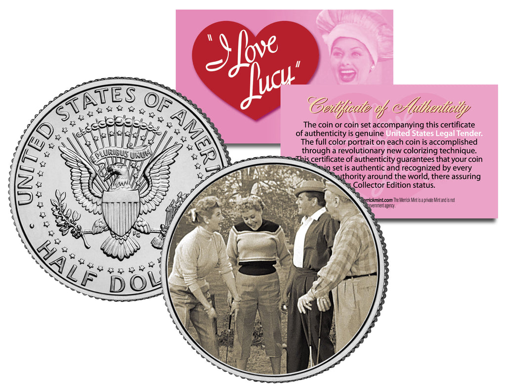 Here is your opportunity to own or to gift, a beautifully colorized JFK Kennedy Half Dollar U.S. Coin, which has been enhanced with an image of Lucy and gang from the "The Golf Game" episode of the I LOVE LUCY legendary TV series. Each OFFICIALLY LICENSED coin comes in a premium coin capsule with a full color Certificate of Authenticity. This Legal Tender United States coin has been colorized with an application of special inks directly to the surface of the coin, using a unique and painstakingly multicolor coin process, which achieves a level of detail, color saturation, and durability that is #1 in the coin industry. The result is an everlasting colorized coin collectible of ultra-high quality. The Kennedy half dollar is a U.S. fifty cent coin with coin year and mint marks chosen at random. I Love Lucy TV Show "Golf Scene" (Season 3, Episode 29, Entitled, " The Golf Game ")