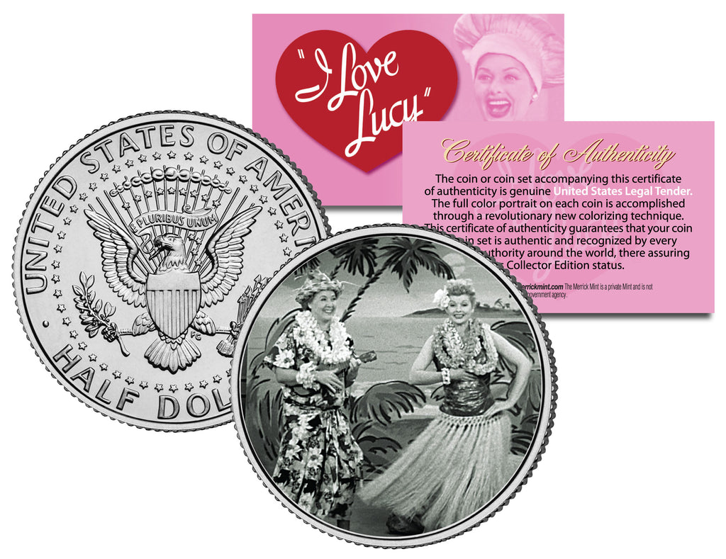 Here is your opportunity to own or to gift, a beautifully colorized JFK Kennedy Half Dollar U.S. Coin, which has been enhanced with an image of Lucy and Ethel from the "Ricky's Hawaiian Vacation" episode of the I LOVE LUCY legendary TV series. Each OFFICIALLY LICENSED coin comes in a premium coin capsule with a full color Certificate of Authenticity. This Legal Tender United States coin has been colorized with an application of special inks directly to the surface of the coin, using a unique and painstakingly multicolor coin process, which achieves a level of detail, color saturation, and durability that is #1 in the coin industry. The result is an everlasting colorized coin collectible of ultra-high quality. The Kennedy half dollar is a U.S. fifty cent coin with coin year and mint marks chosen at random. I Love Lucy TV Show "Hawaiian Vacation Scene" (Season 3, Episode 21, Entitled, " Ricky's Hawaiian Vacation ")