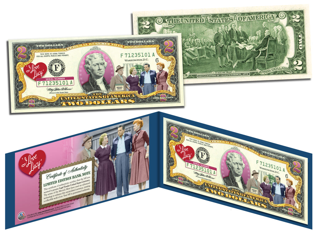 This uncirculated $2 Bill is Genuine Authentic Legal Tender of the United States, which has been enhanced with beautiful colorized images Lucille Ball and the cast from I Love Lucy, including Ricky Ricardo, and Fred and Ethel Mertz. The full colorized images are accomplished through a revolutionary new authentic & genuine colorization process pioneered by The Merrick Mint. Included is a Certificate of Authenticity to guaranty that your bills are authentic and recognized by every monetary authority around the world, and assuring its Collector Edition status. Only genuine Legal Tender $2 United States Bills are used for this unique colorization process. Each $2 Bill is in FRESH, CRISP, UNCIRCULATED condition, and was directly removed from untouched wrapped Federal Reserve sealed packs. Former U.S. President Thomas Jefferson is featured on the obverse of the note, along with the special colorization overlay. The Signing of the Declaration of Independence by John Trumbull is featured on the reverse. It is the only U.S. Currency note that features two Presidents, John Adams and Thomas Jefferson, and it is one of the most rarely seen BILLS in circulation and actual use.